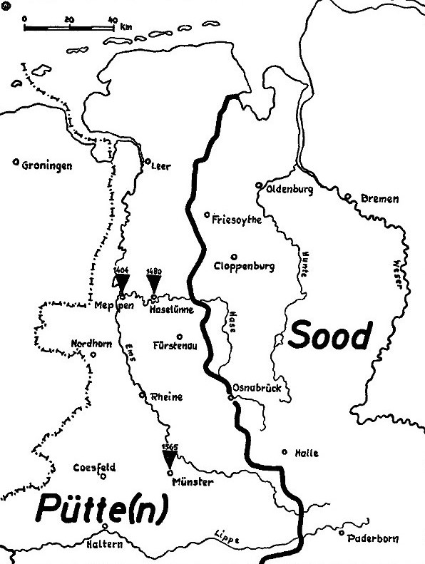 Im Emsland lässt sich die Ausbreitung des Wortes besonders gut verfolgen. Historische Quellen belegen, dass 1404 in Meppen noch ein Haus „dwers over den zoet“ beschrieben wurde – das heißt: gegenüber dem Sod. Auch 1480 ist in einem Kaufvertrag aus Haselünne von „sod“ die Rede, nicht von „Pütte“. Das deutet darauf hin, dass „Pütte“ erst im 15. Jahrhundert aus dem Südwesten nach Meppen vordrang. Bis ins 16. Jahrhundert war dort wohl weiterhin „Sod“ die gebräuchlichere Bezeichnung.