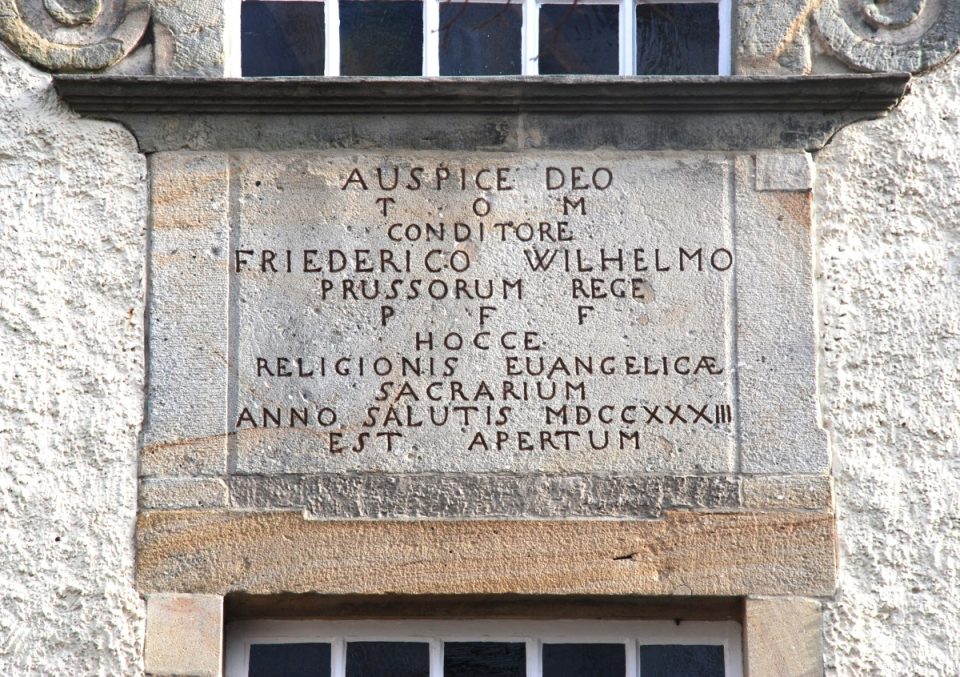 Der im Giebel der Kirche angebrachte Grundstein nennt als Gründer der Gemeinde König Friedrich Wilhelm I. von Preußen. Es ist vielleicht die einzige Kirche, and welcher bis heute an den „Soldatenkönig“ erinnert wird.