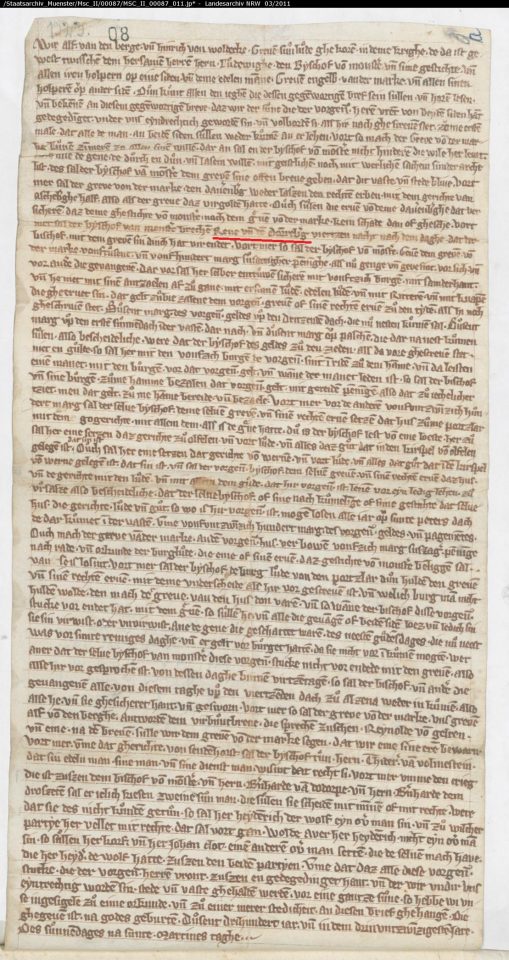 Der Friedensvertrag aus dem Jahr 1323 mit der Verpflichtung, dass der Bischof von Münster Rheine (Rene) und Dor[n]reb[er]g (rote Markierung) „brechen“ solle. Landesarchiv NRW, Abteilung Westfalen, Mscr. II, Nr. 87, S. 13.