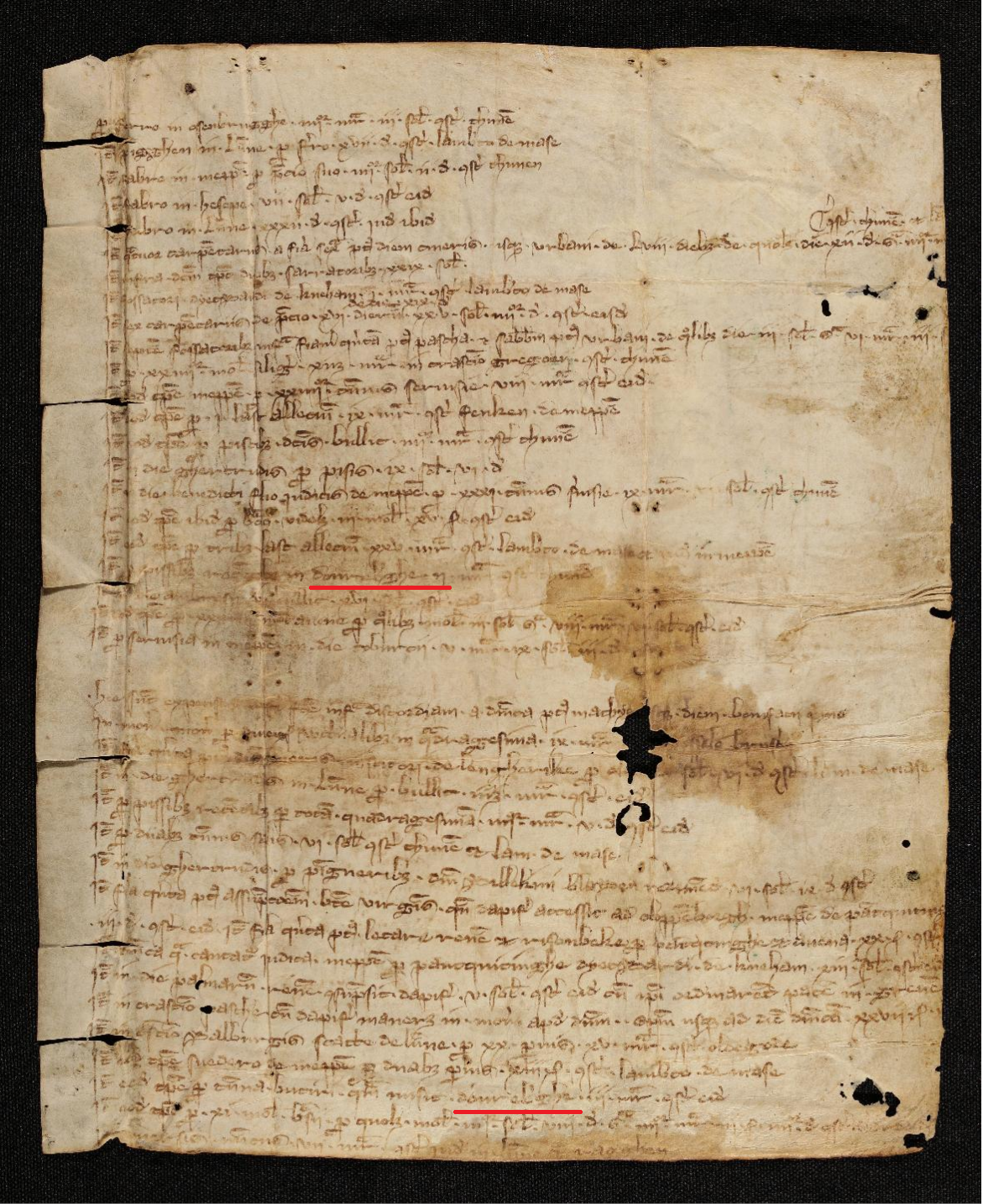 Fragment der emsländischen Amtsrechung von 1318 mit zweimaliger Nennung „Donreberghe“ (rote Markierungen). Universitätsbibliothek Erfurt, Dep. Erf., CA 4° 306.
