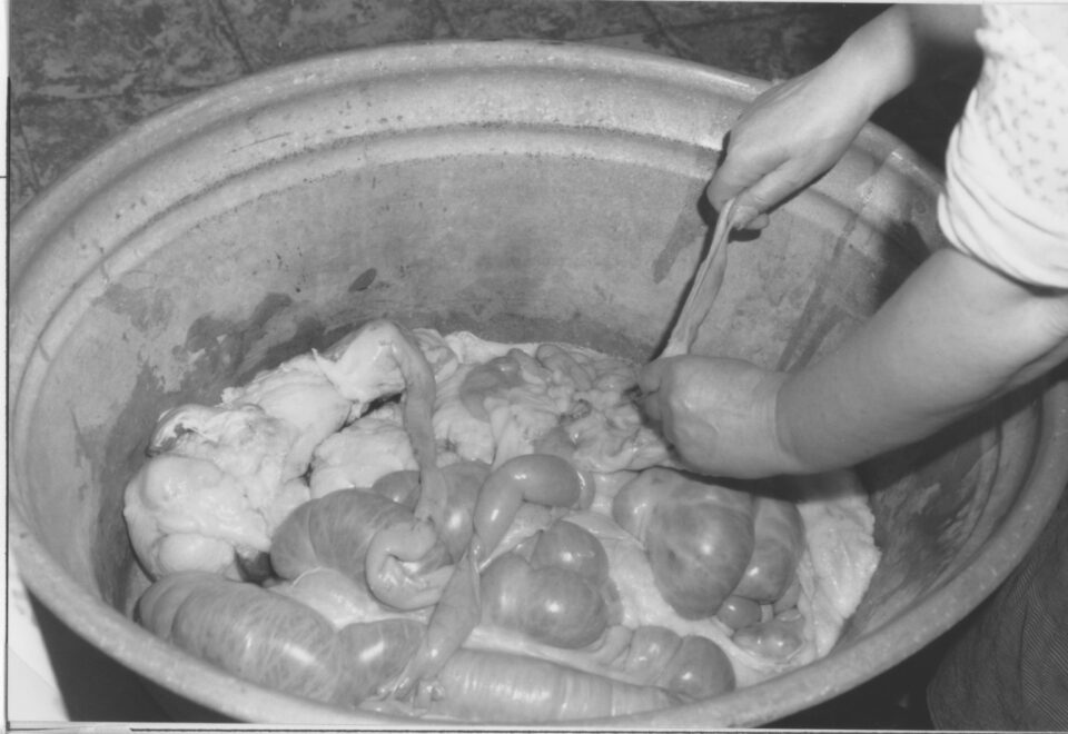 Nachdem die Innereien herausgenommen waren, wartete bereits die nächste Arbeit auf die Frauen: Das Fett zwischen den Därmen musste herausgezupft werden, und die Därme selbst mussten gründlich gereinigt werden. Bis sie sauber und geruchsfrei waren, waren zahlreiche Arbeitsschritte nötig.