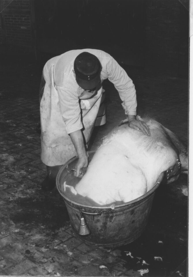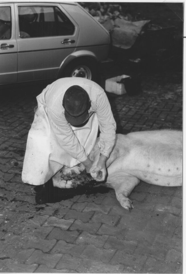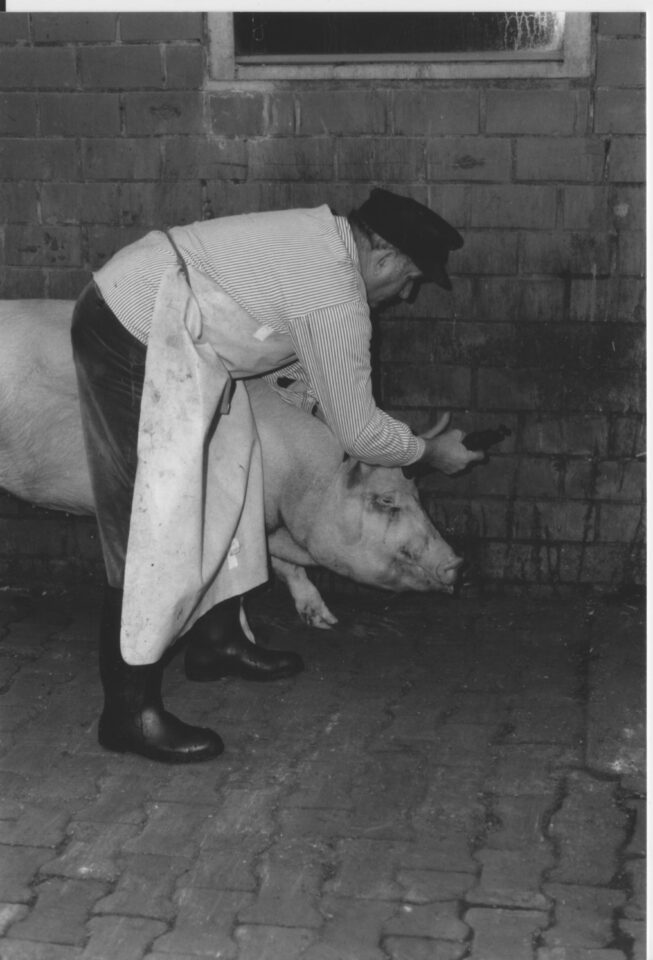 Ganz früh am Morgen erschien der Schlachter auf dem Hof. Zu diesem Zeitpunkt mussten bereits etwa 150 Liter kochendes Wasser bereitstehen, wenn man sich nicht den Unmut des Schlachters zuziehen wollte – denn es musste oftmals schnell gehen. Denn der Schlachter war ein gefragter Mann. Zunächst wurde das Schwein betäubt: mit einem Stahlbolzen, den der Schlachter mit einem Hammer in die Stirn schlug. Später kamen dann Bolzenschussapparate auf, die wesentlich sicherer arbeiteten. Das betäubte Tier wurde anschließend abgestochen. Mit einem spitzen Messer setzte der Schlachter am Hals an, stieß bis ins Herz und durchtrennte die Halsschlagader.