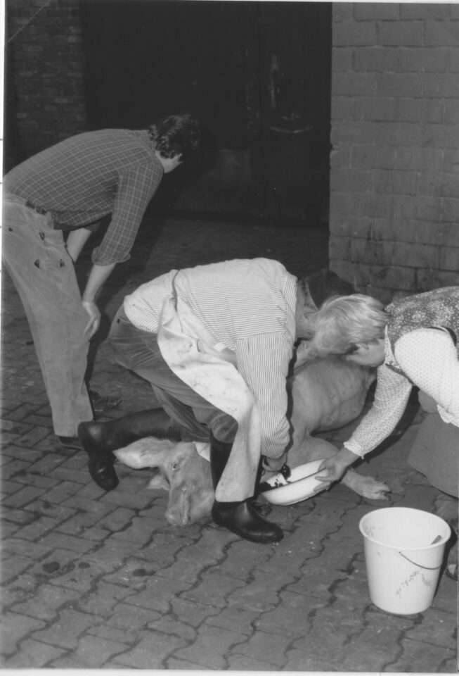 Nun begann die Arbeit der Frauen. Das Blut, das ausströmte, wurde in Pfannen aufgefangen und in einem großen Gefäß gesammelt. Es musste so lange gerührt werden, bis es erkaltet war, denn es durfte auf keinen Fall gerinnen – schließlich wurde es später weiterverarbeitet.